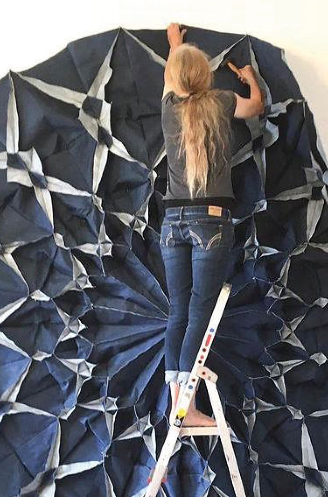 „In der Falte liegt ein wesentliches Potential für den Raum. Aus einem kompakt zusammengelegten Objekt entsteht bei dem Prozeß des Auseinanderfaltens ein in den Raum greifender Körper. Dieser umschließt Raum, trennt ihn in innen und außen, in davor und dahinter“, hat sie in einem Statement für eine Ausstellung geschrieben (2016). Strenge und Lapidares, das die weiche Materialität vermittelt, treffen zusammen und initiieren eine Vielzahl an Wahrnehmungen und Empfindungen. Vielleicht denkt man, zumal bei der Fragilität des Stoffes, an die Kunst der Papierfaltung oder an das Kinderspiel der über die Finger gestülpten, wechselseitig aufklappbaren Kästchen von Himmel und Hölle. Oder an ein Kaleidoskop. Weiterhin stellen sich Analogien zu Phänomenen der Fauna und Flora ein. Aber man kann das Relief in seiner überwältigenden Größe, plastischen Präsenz und farblichen, schattenreichen Differenziertheit auch als abstrakte Malerei verstehen. Die Werke von Alke Reeh tragen die Regelhaftigkeit und Würde eines Mosaiks, das mit den Händen zusammengefügt ist. Die sachliche Geometrie und ihre Rhythmisierung bilden mit der emotionalen Befindlichkeit, mit Stofflichkeit, Haptik und Licht eine Einheit.