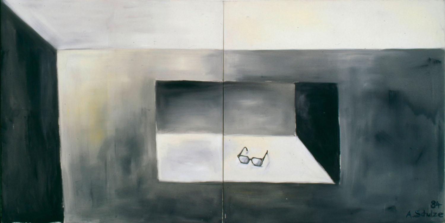 Denkbar ist, dass Schulzes malerische Würdigung des banalen, isoliert auftretenden Gegenstands von der Kunstszene in Düsseldorf beeinflusst ist. Schulze studiert an der dortigen Akademie in der Malerei-losen Zeit der Minimal und der Concept Art. „Die „Kastenbilder“ reflektieren diese Erfahrung“, hat Andreas Schulze im Gespräch mit Wilfried Dickhoff gesagt. „Es sind abgemalte Don Judd-Kästen. Die hineingemalten Gegenstände sollen zeigen, dass das abgestellte Weinglas auf einer Mini mal skulptur nicht das Problem des Künstlers, sondern das des Betrachters ist.“ (Flash Art, 129, 1986) Dieter Krieg kam dabei als Maler, der in seiner eigenen Kunst banale Sachen in expressiv pastoser Malerei monumentalisierte und dazu aus ihrem Kontext nahm, undProfessor einer Malklasse gerade richtig. Andreas Schulze malt stofflich,dabei akkurat, fast penibel. Die Dinge werden bei ihm geheimnisvoll, sie befindensich in Räumen, mitunter als Requisiten des Wohnlichen (wie ebenKonsolen oder Kom mo den) oder eben als weite, zum Muster hin stilisierteLandschaften mit Bäumen oder Bergen. Die Valeurs mit der Romantik desSonnenuntergangs werden mitunter mit der Realität von Autoauspuffen odereines Verkehrsstaus konfrontiert.