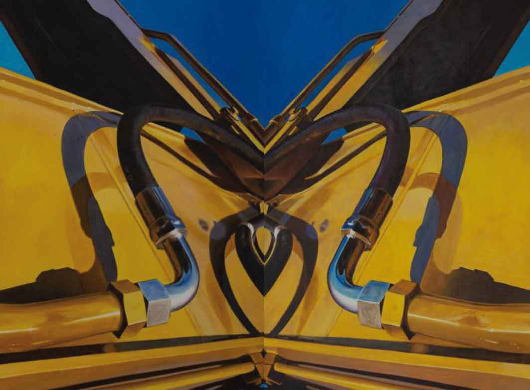 Leuchtendes Blau und Gelb ziehen die Blicke an wie ein strahlendes Kodak-Werbephoto. Klare, industriell anmutende Elemente spiegeln sich in zwei Bildhälften. Vor gelben Blechen ändern gebogene Rohre streckenweise ihre äußere Hülle: Gelackter und blanker, harter Stahl wechselt zu weichem Gummi oder Kunststoff. Die Rohre werfen Schatten, deren logische Natur Rätsel aufgibt. Sie überschneiden sich mit ähnlich gebogenen Formen, deren Himmelblau ganz unerklärlich bleibt. Oberhalb der gelben Bleche treten breite dunkle Streifen diagonal hervor, die an Laufbänder in Untersicht erinnern mögen. Sie starten jeweils in der Bildmitte und scheinen sich bis über den Bildrand hinaus zu strecken. Ihre schmalen seitlichen Begrenzungen reflektieren nur ansatzweise das Gelb der Bleche unter ihnen.