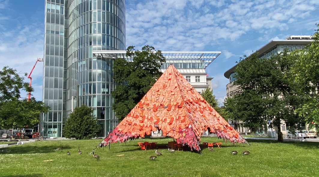 Die Ausstellung zeigt dazu erste Beispiele, die dazu einladen, den fragmentierten Raum der Graf-Adolf-Straße wieder als gelebten Stadtraum zu entdecken. Ein Parcours führt entlang künstlerischer Arbeiten in verborgene Nischen, zu unentdeckten Orten oder zu kleinen Parks und Plätzen, die der Verkehrsdynamik zum Opfer gefallen scheinen. Insellagen wie die der Bahnstraße, die Andreas Wegner mit einem Baldachin aus Bannern zum kulinarischen Bermudadreieck erhebt, aber auch solche am Schwanenspiegel, in die Moritz Riesenbeck eine weitere autarke Zelle einspeist, kommen wieder ins Blickfeld. Soziale Brennpunkte wie der Mintropkiez, wo die legendäre Band „Der Plan“ ein ganz besonderes Konzert im Ellington gibt, oder der Stresemannplatz, wo Christoph Schäfer den Blick auf die sozial engagierte Arbeit der franzfreunde mit den Wohnungslosen Düsseldorfs lenkt, offenbaren sich als notwendige Orte urbanen Lebens. Lautstarke Verkehrskorridore, denen Katharina Sieverding mit einem monumentalen Bildfries entgegentritt und die im Projekt zum Reallabor der Verkehrswende werden, verknüpfen sich mit edlen Shoppingboulevards wie der Kö, die das Künstlerinnenkollektiv Ortolana in den Duft des Geldes taucht.