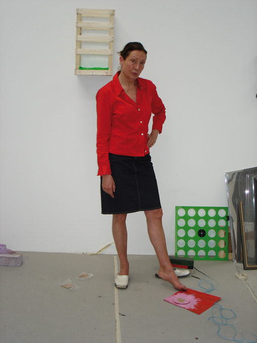 „Ruhe vor dem Sturm“, heißt die aktuelle Ausstellung im Museum Morsbroich in Leverkusen. Sie widmet sich der Rezeption der US-amerikanischen Minimal Art durch die Künstler im Rheinland. Diese verbinden die Verknappung mit dezidierter Inhaltlichkeit, Humor und gesellschaftlicher Auseinandersetzung. Zu den eingeladenen Künstlern gehört Erinna König, die zuletzt umfassend 2010 in „Der Westen leuchtet“ im Kunstmuseum Bonn vertreten war, einer exemplarischen Bestandsaufnahme der aktuellen Kunst dieser Region. Erinna König zeigte dort Bilder und Objekte der 1990er und 2000er Jahre, die für ihr Werk charakteristisch sind. Dazu gehört, dass etliche Arbeiten auf die Wand bezogen sind, etwa als Relief oder indem sie an dieser lehnen. Zum Umgang mit der dritten Dimension trägt bei, dass Erinna König breite und tiefe Rahmenstrukturen sowie Gitter verwendet und die Zwischenräume aktiviert. Auch nimmt sie Aussparungen vor, indem sie Silhouetten aus Holzflächen schneidet oder verschiedene Partien ineinander verzahnt. Als Grundlage dienen Fundstücke bzw. Teile von diesen, die überwiegend aus der Serienproduktion unseres Alltags stammen. In den fertigen Konstellationen scheinen narrative und emotionale Zusammenhänge auf, welche im Titel unterstützt werden. Vor allem aber bleibt der Bezug zu unserer Lebenswirklichkeit gegeben. Das alles geschieht lakonisch und überraschend, differenziert, noch mit Hinweisen auf das Einzelschicksal und einigem Humor, auch in der Auseinandersetzung und Konfrontation der künstlerischen Medien. So war in Bonn die Arbeit „Die Schatten werden länger“ (2010) ausgestellt, ein Objekt, bei dem Erinna König den Illusionismus als Maßnahme der Malerei bedenkt: Ausgehend von einer schwarzen Rückenfläche, lehnend an der Wand und mit einem Granitblock mit dem eingravierten Jahr 1947 an der Seite, ragt ein monochrom roter Teppichvorleger mit schwarzer zungenförmiger Partie in den Raum. Perspektivisch wird der Wurf eines Schattens – wie von einem Grabstein aus – evoziert. Eine Pointe ist, dass diese Arbeit als Edition vorliegt. In den Block kann ein andere individuelle Zahl eingraviert werden und jedes Exemplar hat einen Teppichvorleger in einer anderen vibrierenden Abstufung von Rot: Malerei – als Farbigkeit, Farbkontrast und als Auftrag – wird zu einem Aspekt dieser zunächst so lapidaren Arbeit.