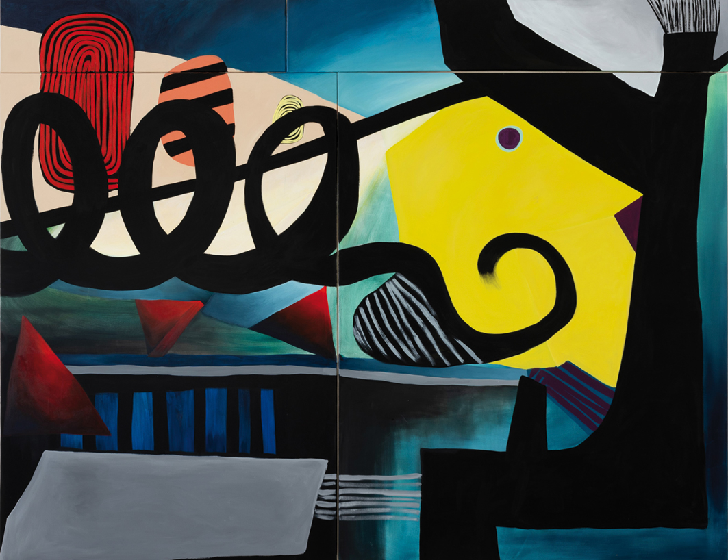 Lebensbejahend, vital und selbstbewusst tritt mir das große Querformat entgegen. Eine angedeutete Balkonbrüstung und eine neutral graue Fläche, die ein Tisch sein könnte, verorten mich. So kann mein Blick weiter ins Bild schweifen, in ein unbegrenztes Blau, vor dem allerlei Formen in bunten Farben agieren. Eine dicht schwarze Linie kringelt sich, als wäre sie auf eine Schnur gefädelt. Ihr rechtes Ende rundet sich vor dem Gelb und lässt an einen Schnäuzer denken. Ein darüber eingefügter schwarzer Punkt ergänzt den Eindruck eines Gesichts im Profil. Gleichzeitig aber verweigern die Konturen der gelben Fläche eine solche Identifizierung. Markant rahmt eine schwarze, sperrige Farbfigur die gelbe Fläche und bildet eine Begrenzung der Szene zur Rechten. Zur Linken tänzeln drei rote Dreiecke um die Form, die als Balustrade gedeutet wurde. Streifen melden sich mehrfach zu Wort, ob klar und geometrisch gefasst oder freihändig gemalt. Drei ovale Flächen nehmen sie vor rosa hautfarbenem Grund auf und bilden eine Art Echo zu den drei schwarzen Schlaufen. Die größte erinnert an Linienführungen der Maori-Rindenmalerei. Daneben wirken die parallel schräg verlaufenden Streifen wie ein heraldisches Fragment.