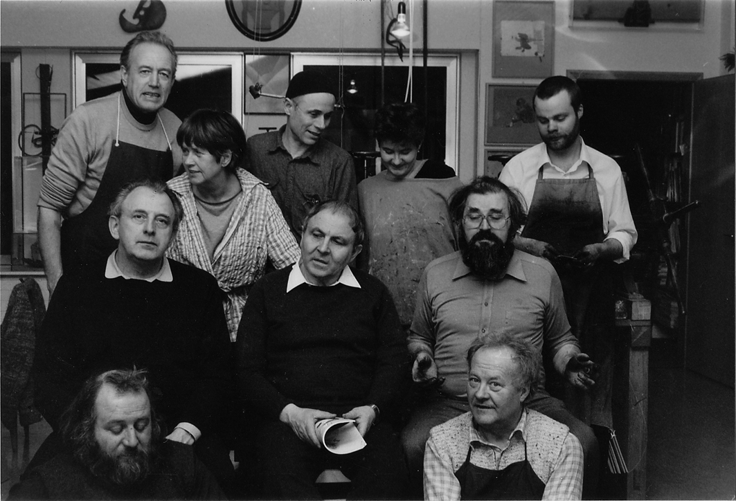 Holger Runge wurde 1925 in Weimar geboren. Er hat dort an der Hochschule für Bildende Künste und ab 1948 in Düsseldorf an der Kunstakademie, in der Grafikklasse von Otto Coester studiert. Später ist er hier selbst Lehrbeauftragter und danach – wie passend – Dozent für Marionetten- und Musikinstrumentenbau am Werklehrerseminar in Düsseldorf. Bereits 1963 hat er die Osterather Radiergemeinschaft begründet, zunächst mit Hans und Franz Joseph van der Grinten, die bei ihm in seinem Haus in Bovert die handwerklichen Techniken an der Radierpresse erlernen. Bald schließen sich weitere Künstler an, darunter Erwin Heerich, Gottfried und Martel Wiegand, Rolf Crommenauer, Karl Burgeff sowie die Schweizer André Thomkins, Franz Eggenschwiler und Alfonso Hüppi. Hier wird ausprobiert und gearbeitet, diskutiert und gefeiert. „Zuerst sitzen die Männer in einem Atelier im Erdgeschoss des Einfamilienhauses. 1972 zieht der Kreis in ein größeres und helleres Atelier im oberen Geschoss. Zuvor war ein zweites Stockwerk auf das Flachdach aufgesetzt worden. ‚Jeder hatte da seinen festen Platz‘, sagt Holger Runge.“ (Andreas Speen, Mehr in Meerbusch 10.10.03)