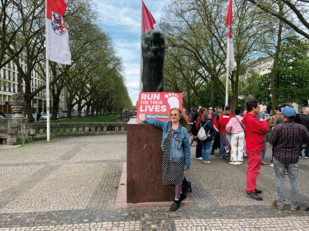 Bis alle Geiseln wieder zu Hause sind, so lange treffen wir uns jeden Sonntag um 16.00 Uhr am Bergischen Löwen, Königsallee, Ecke Graf-Adolf-Platz. Friedlich und still gehen wir 18 Minuten die Kö entlang und zurück BIS ALLE GEISELN WIEDER ZU HAUSE SIND (run4lives.org). Ostersonntag stiegen 133 gelbe Luftballons zu ihrer Erinnerung gen Himmel.