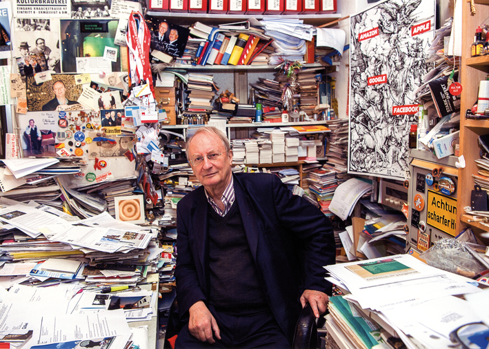 Solche Plakate entstehen nach wie vor, flankiert von Postkarten, nun mit Angela Merkel und Uli Hoeneß, zur AfD, zu Trump und zu Amazon, das die Mitarbeiter ausbeutet und den Buchhandel zerstört. Das Erschreckende ist ja, sagt Klaus Staeck wortgewaltig und leidenschaftlich, dass sich keins der früheren Anliegen erledigt hat. Aber: „Das ganze Leben besteht aus kleinen Schritten.“