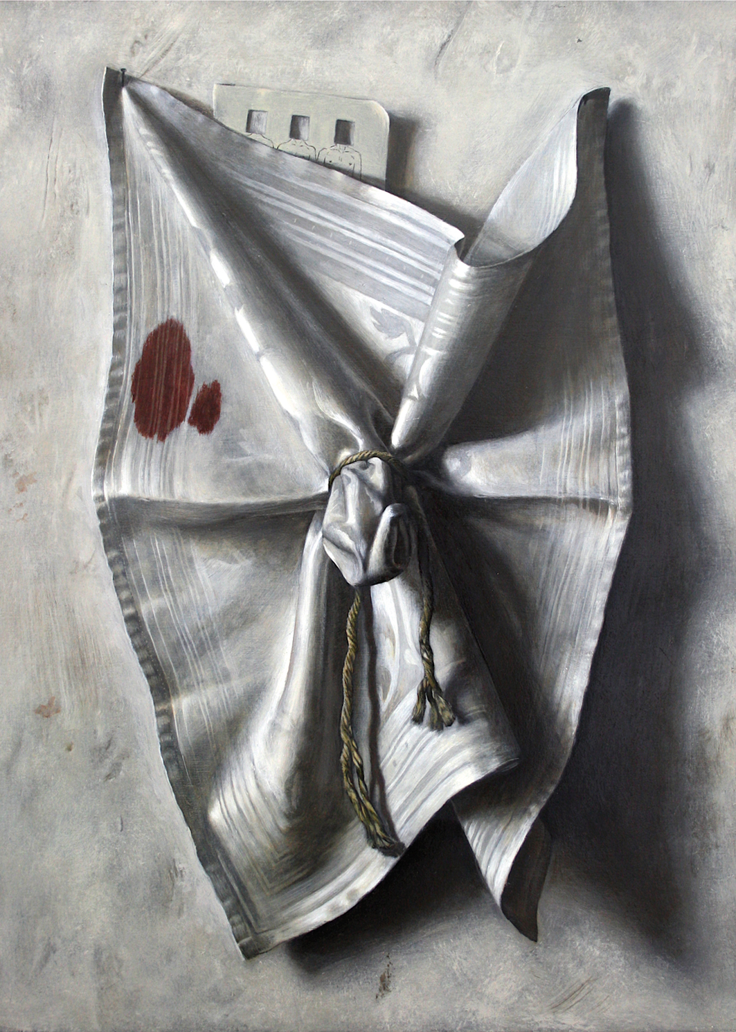 Es sind archaisch anmutende Signale, die den Blick in dieses altmeisterlich fein gemalte Bild hineinziehen. Blutflecken prangen am Rande einer gebügelten weißen Damastserviette, unter der mit altem Paketgarn abgebunden der im Titel genannte „Knüppel“ steckt. Er lässt seiner Bezeichnung und seiner Gestalt nach auf einen Penis schließen. Paketgarn und Falten erscheinen mit ihren Schatten plastisch greifbar und spielen gekonnt mit Illusion und Realitätsanspruch. Das Damastmuster der Serviette zeichnet sich präzise ab. Die Damastwebtechnik ist schon im frühmittelalterlichen Byzanz bezeugt. So verweist das dargestellte Material auf eine alte Kultur und verbindet sich gleichzeitig mit dem bürgerlichen Anspruch auf gepflegte Häuslichkeit.