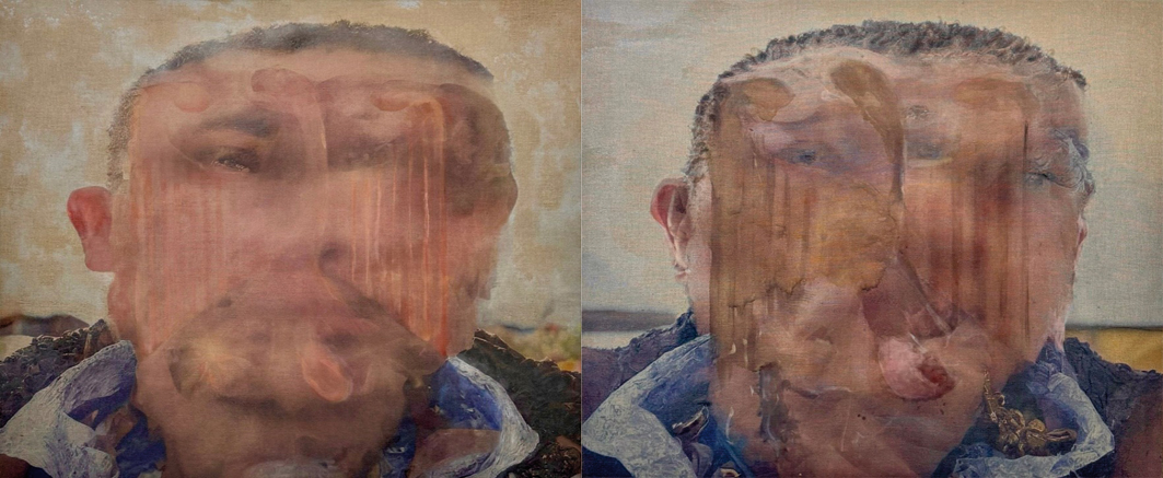 Ein Diptychon hatte, sobald die christliche Religion im Abendland dominierte, vorrangig die Funktion eines Andachtsbildes. Zusammengeklappt war es leicht zu transportieren und diente dem privaten Gebrauch unterwegs. Später entwickelte sich daraus das profane Doppelporträt. Im Bildtitel enttarnt sich der Künstler als Porträtierter in zwei Ansichten, um sich malerisch zugleich zu entfremden und diesen Prozess in zwei Phasen anzuzeigen. Das Individuelle weicht hinter der Adlerschablone zurück, die wie eine Maske Selbstverleugnung und Schutz gewährt. Das Ungefähre der Porträts lässt an Phantombilder im forensischen Kontext denken. Schonungslos und mutig zeigt uns der Künstler sein eigenes Konterfei in einer visionären malerischen Auseinandersetzung, in der er die potenzielle Auswirkung rechtsextremer Infiltration auf sich selbst auslotet.