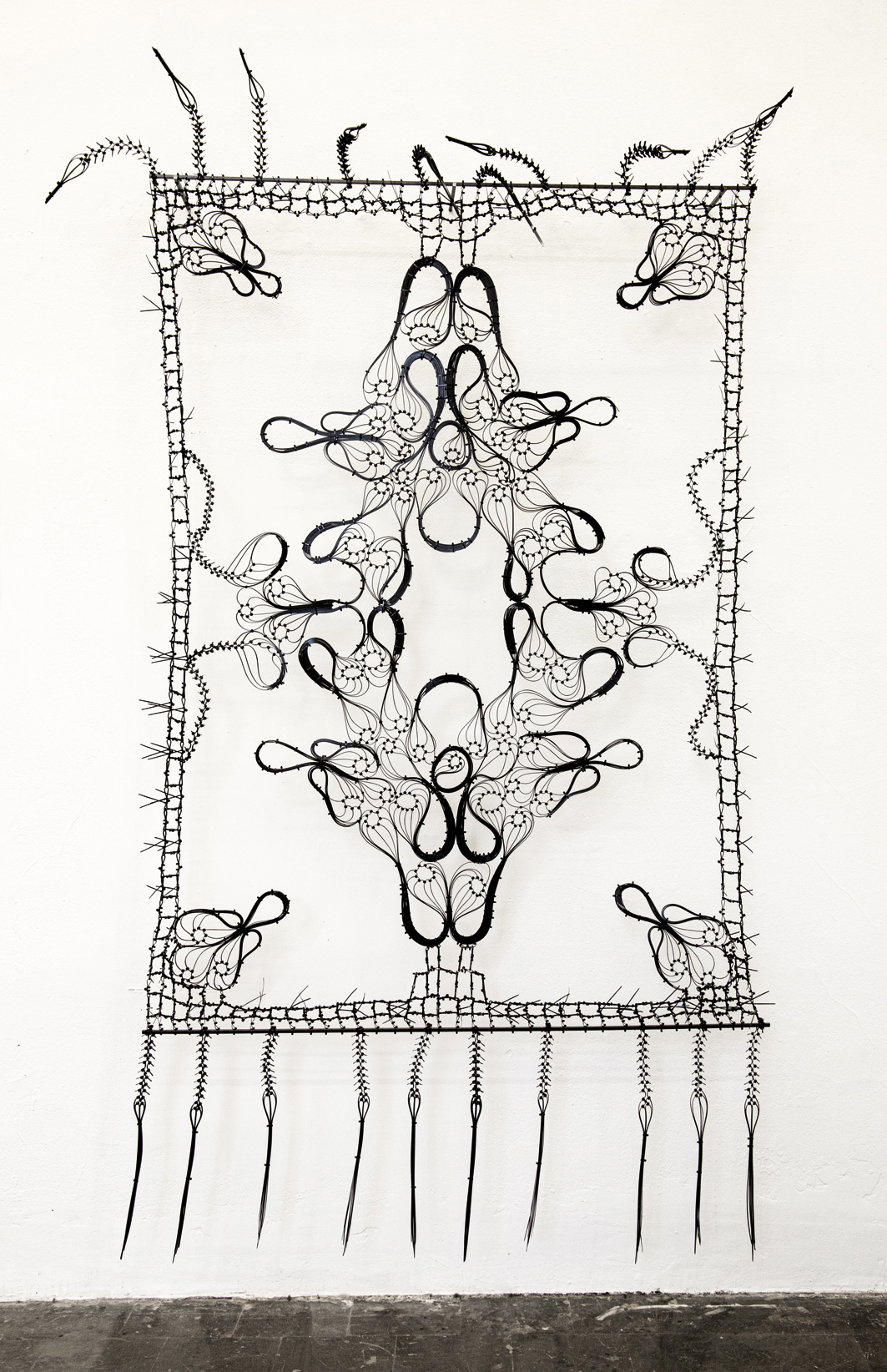 Zwei vertraute Welten treffen irritierend aufeinander. Linien und Konturen zeichnen eindeutig einen Teppich, wie wir ihn aus der Wohnkultur kennen. Kabelbinder aus Polyamid sind der vorherrschende Werkstoff. Sie bilden zwischen den zwei stabilisierenden Stahlröhren am oberen und unteren Rand die ornamentalen Linien und Konturen. Abstandhalter sorgen dafür, dass das Liniengeflecht frei im Raum zu schweben scheint. Kabelbinder erscheinen uns vertraut, wenn auch aus der Welt der Baumärkte. Sie schaffen Ordnung, indem sie Kabel miteinander verbinden, und werden gar von der Polizei als Einweghandschellen eingesetzt. Hier zaubern sie die Schönheit des Teppichmusters wie filigrane Bleistiftlinien und erinnern zugleich an Stacheldraht. Das verwendete Material untergräbt subtil die Wahrnehmung des vertraut erscheinenden Teppichformats. Traditionelle Werte und heutige Nützlichkeitsorientierung stoßen ebenso faszinierend wie unbarmherzig aufeinander. Auch das Fehlen von Farbe reduziert das vertraute Wohlgefühl, das ein Teppich zu erzeugen vermag.