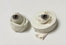 Zwei Glasaugen, jeweils in aufgerissene weiße Luftballongummis gehüllt, ruhen auf kleinen...