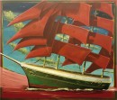 Eindeutig ein Segelschiff! Mit seinen voll geblähten roten Segeln wirkt es kraftvoll und dynamisch,...