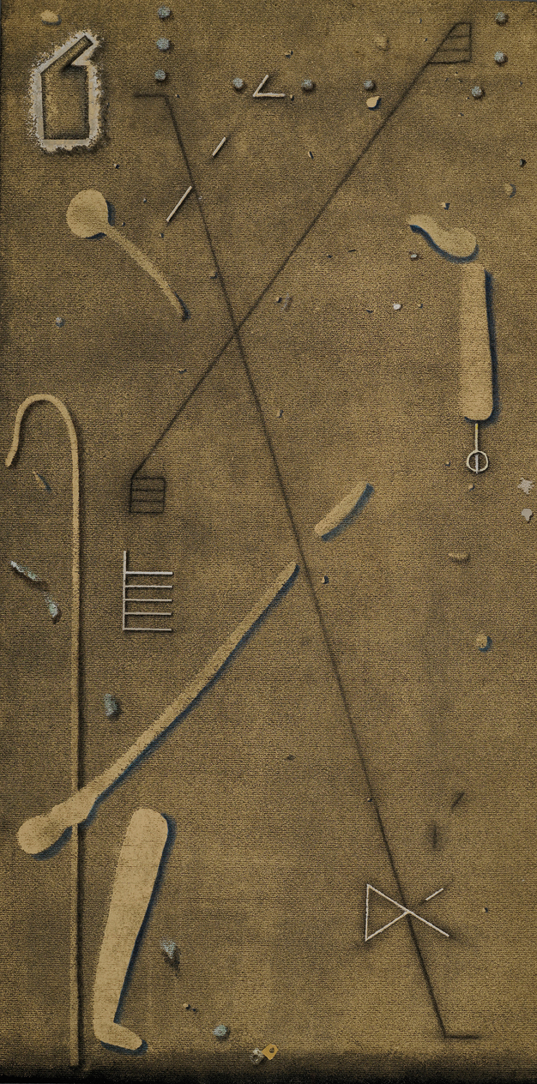 Archaisch und rätselhaft kommen die einzelnen Bildzeichen daher. Ein Stock oder Stab. Ein grober Kamm – oder ist es ein anderes Werkzeug? Eine Form erinnert an ein unteres Bein mit Fuß von Ausschneide-Gliederpuppen. Eine andere an einen Löffel. Eine weitere erlaubt vielleicht die Assoziation mit einer Beinprothese, die beweglich an einem Fuß hängt. Eine Nadel mit V-förmigem Ende scheint die Oberfläche zu durchstechen. Eine durch einen Lichtkranz hervortretende Figur erinnert an einen Kanister mit seiner Tülle. Auf der verkrumpelten Oberfläche treten kleine Fundstücke hervor, die vom Spielen oder Arbeiten liegengeblieben zu sein scheinen. Wie Fragmente der Braille-Schrift appellieren sie an den Tastsinn. Ein Bilderrätsel? Hieroglyphen? Rätselhaft!