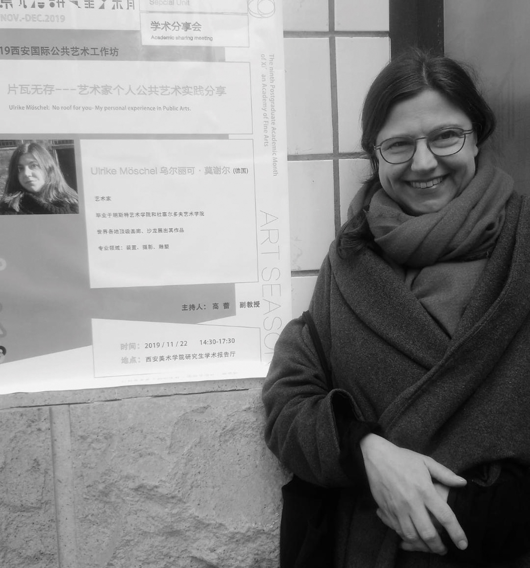 Neben den Installationen und Skulpturen hat Ulrike Möschel Videoarbeiten, Textblätter sowie Zeichnungen geschaffen. Sie filmt und fotografiert alltägliche Situationen in urbanen Räumen und fokussiert anlässlich von Stipendien-Aufenthalten Gebäudestrukturen in den fremden Ländern. Die Zeichnungen entstehen vor allem mit Tinte, Kreide und Lack auf kleinformatigem farbigem Papier. Sie zeigen, erfasst wie Silhouetten und mitunter mit Referenzen an Pieter Bruegel, einzelne Figuren, Ausschnitte städtischer Module und vor allem Baumstücke und Vögel in Bäumen oder auf Mästen, den weiten Himmel im Hintergrund. - Natürlich hängt mit all dem der ganz neue, linear angelegte „Drachen“ zusammen, der sich mit seiner fragilen Gliederstruktur derzeit im Garten der ehemaligen Reichsabtei Kornelimünster von der Erde in die Bäume zu erheben scheint und von dort am Himmel verschwinden könnte.